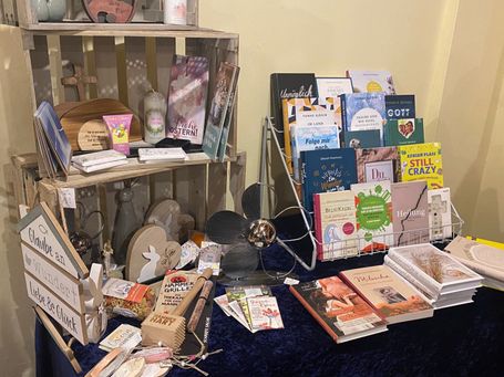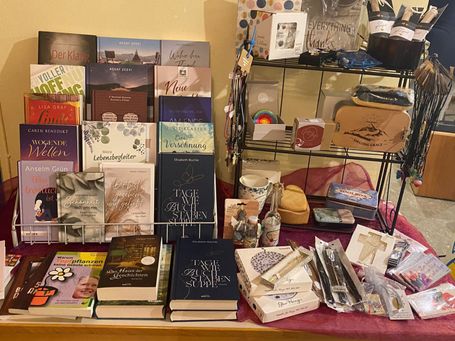 Am 9. Februar 2026 durften wir Ruth Brehm mit ihrer „Buchhandlung on tour“ in der Frauenauszeitgruppe begrüßen, auch das „Basecamp“ war mit dabei. Aufgewachsen in einem christlichen Freizeitenheim und fest im Glauben verwurzelt, liegt es ihr am Herzen, Menschen durch Bücher Gottes Liebe weiterzugeben und den Glauben neu oder tiefer zu entdecken. Gemeinsam mit ihrer Kollegin Isolde gestaltete sie berührende Buchlesungen, erzählte aus ihrem Leben und brachte eine vielfältige Auswahl inspirierender Literatur und Geschenkartikel mit. Außerdem erfuhren wir von ihrer Vision, ihre Buchhandlung in Speichersdorf zu einem Buchcafé weiterzuentwickeln, das zum Verweilen und Begegnen einlädt.